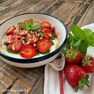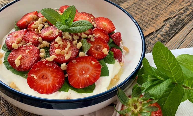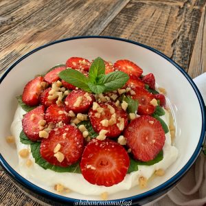 Süzme yoğurdun içerisine zeytinyağı, tuz ve karabiber eklenir ve macun kıvamına gelene kadar güzelce karıştırılır. Servis tabağına alınır. Üzerine nane yaprakları tam kapatacak şekilde eklenir ve üzerine 1 yemek kaşığı zeytinyağı gezdirilir. Üzerine halka halka dilimlediğimiz çilekler eklenir, son olarak da ceviz serptik mi servise hazıırrrr. Çok lezzetli ve tazeleyici bu lezzeti mutlaka denemelisiniz 😋😍 tarif için @nidakonacakli ya çok çok teşekkürler