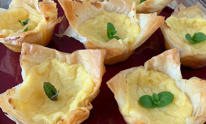 3 yemek kaşığı tereyağı eritilir ve tezgaha yaydığımız 1 yaprak baklava yufkası güzelce yağlanır. Üzerine diğer yaprak konur yağlanır. Bu şekilde 10 kat yaprak üst üste yağlanarak konur. 12 eşit kareye bölünecek şekilde yaklaşık 5×5 kareler kesilir. Muffin kabına her kare fotograftaki gibi yerleştirilir.