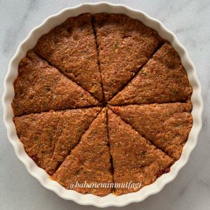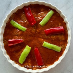 Kalan salçayı suyla açarak kıymalı karışımın üzerine eşit şekilde dökün. Süslemek için sivri biber ve kırmızı kapya binerle dilimleyerek üzerine koyup 180 derecede 35-40 dakika pişirin. Yanına bir de pilav yaptınız mı offff muhteşem bir menü sizlerle 😍😋